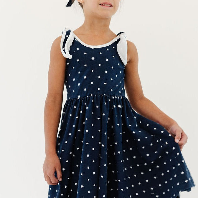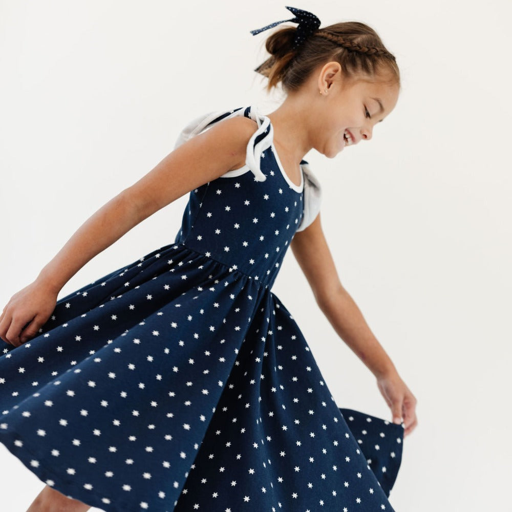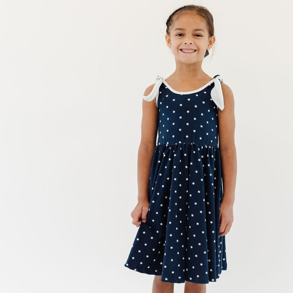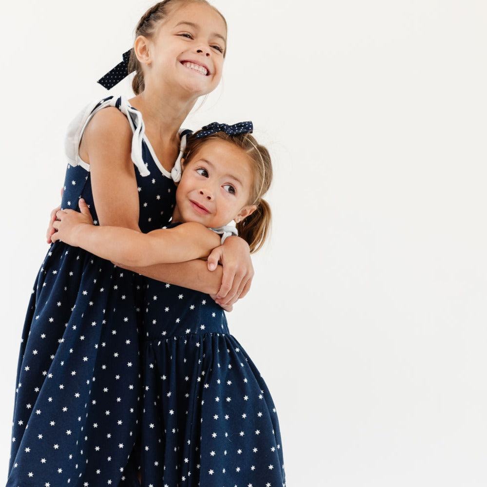 One of my favorite prints to date. Just the perfect little “picnic blanket” design and the blue hearts make it work for Memorial Day or 4th of July! It’s my girls’ new favorite and of course they love the bows on the shoulders!