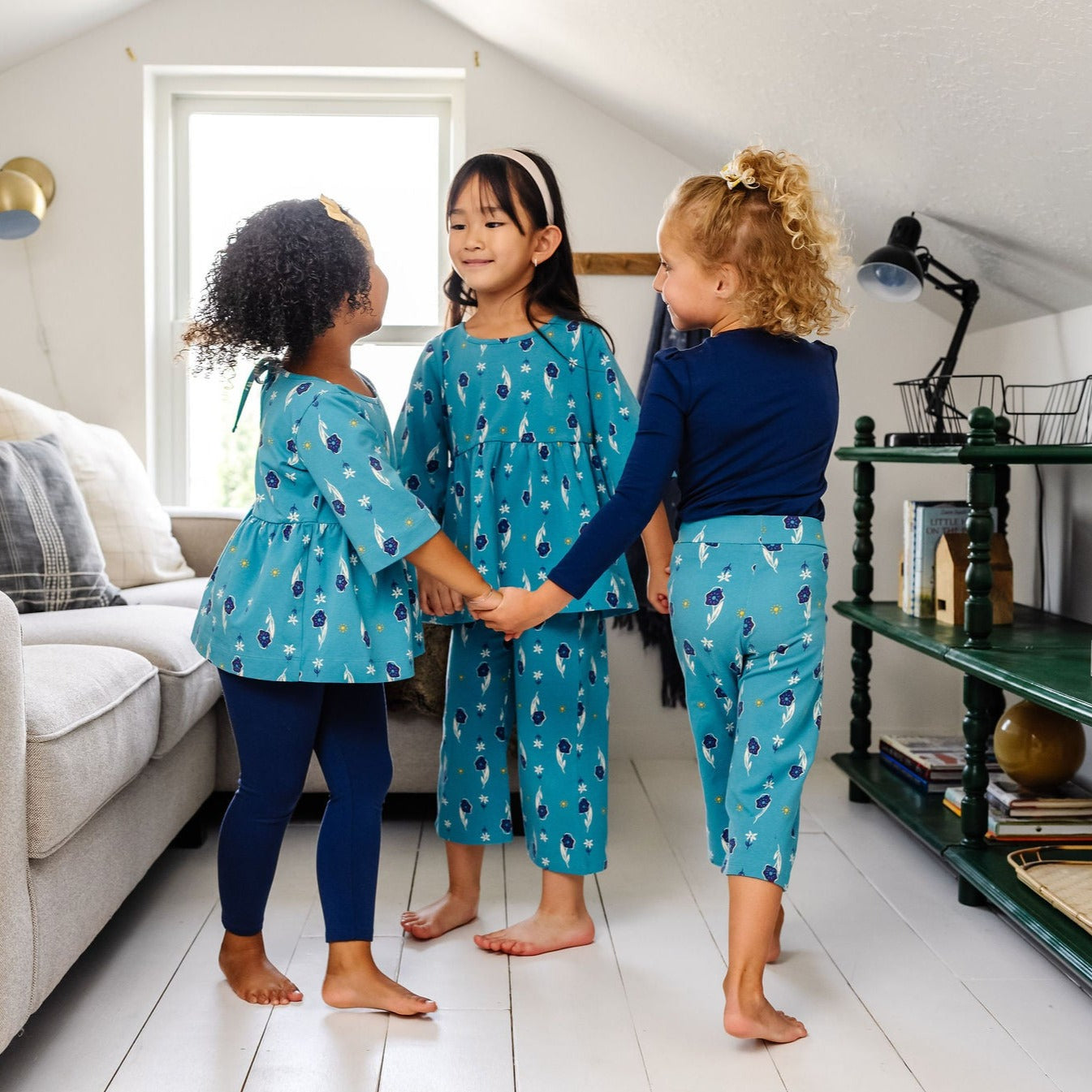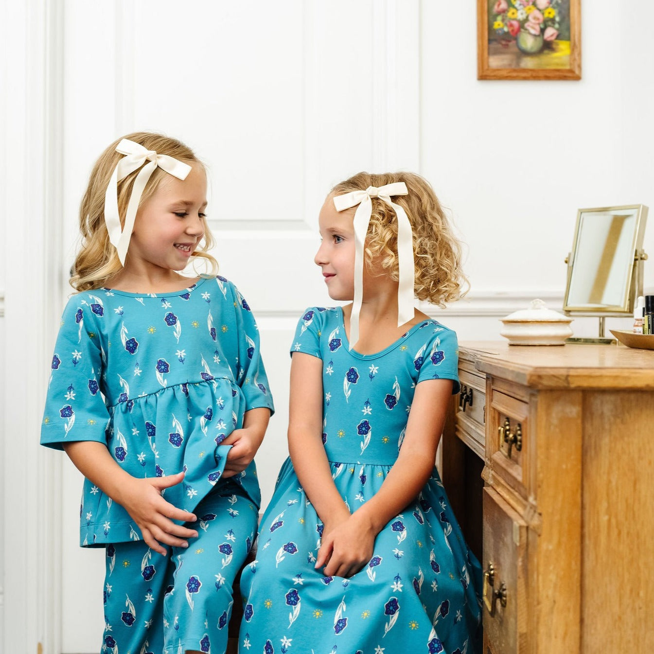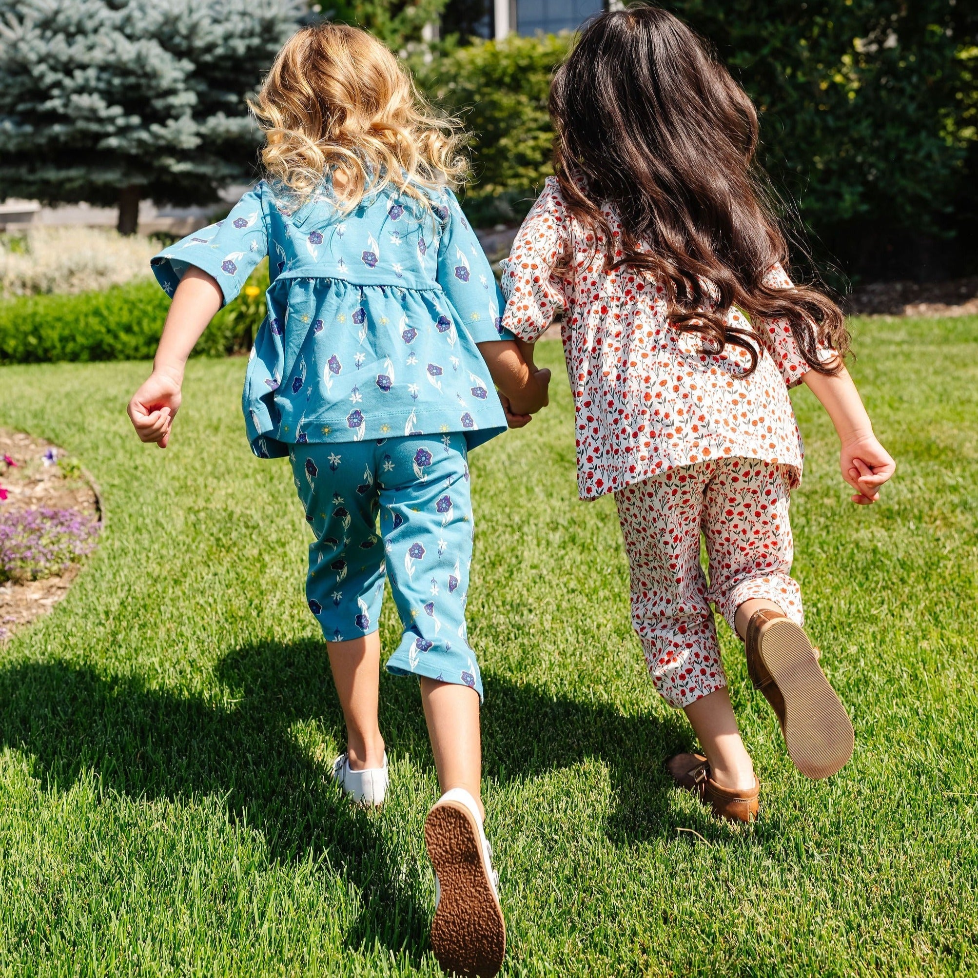 Our popular Bloom top is back, this time with a twist! We've taken the same bell sleeves and keyhole back detail you've come to love, and added matching pant bottoms for a put-together look that still encourages playtime.