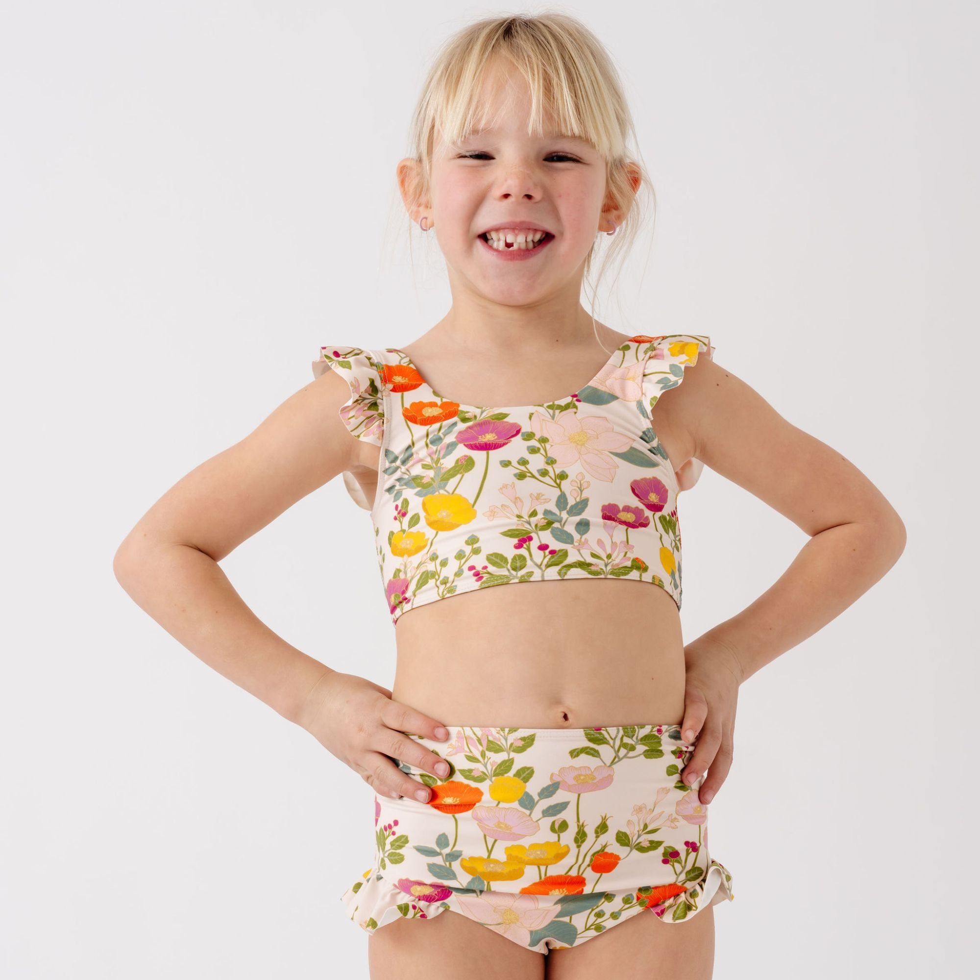 Make a splash at the pool or beach with this adorably frilled bathing suit. Made of 80% recycled polyester, you can feel just as good about her wearing it as it looks.