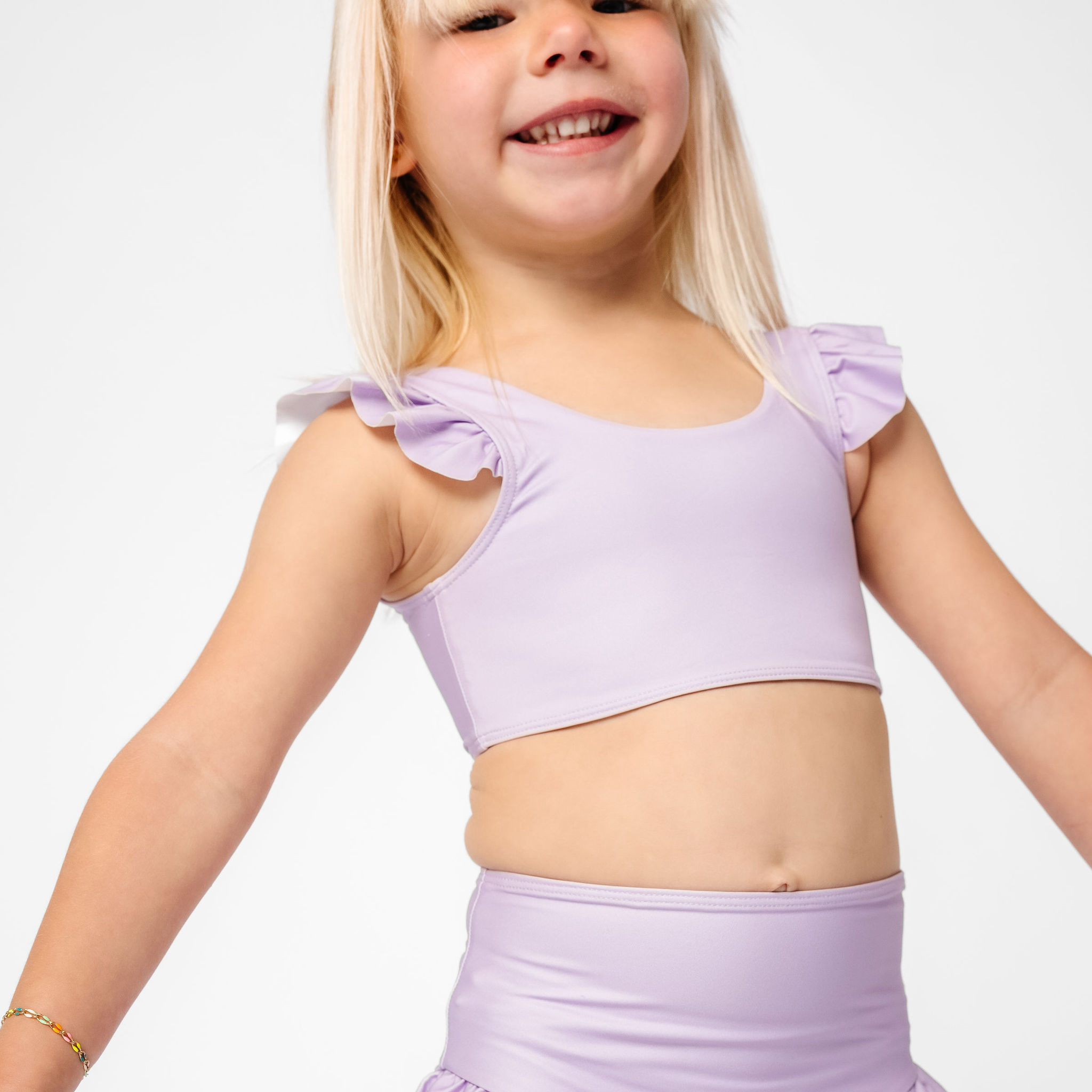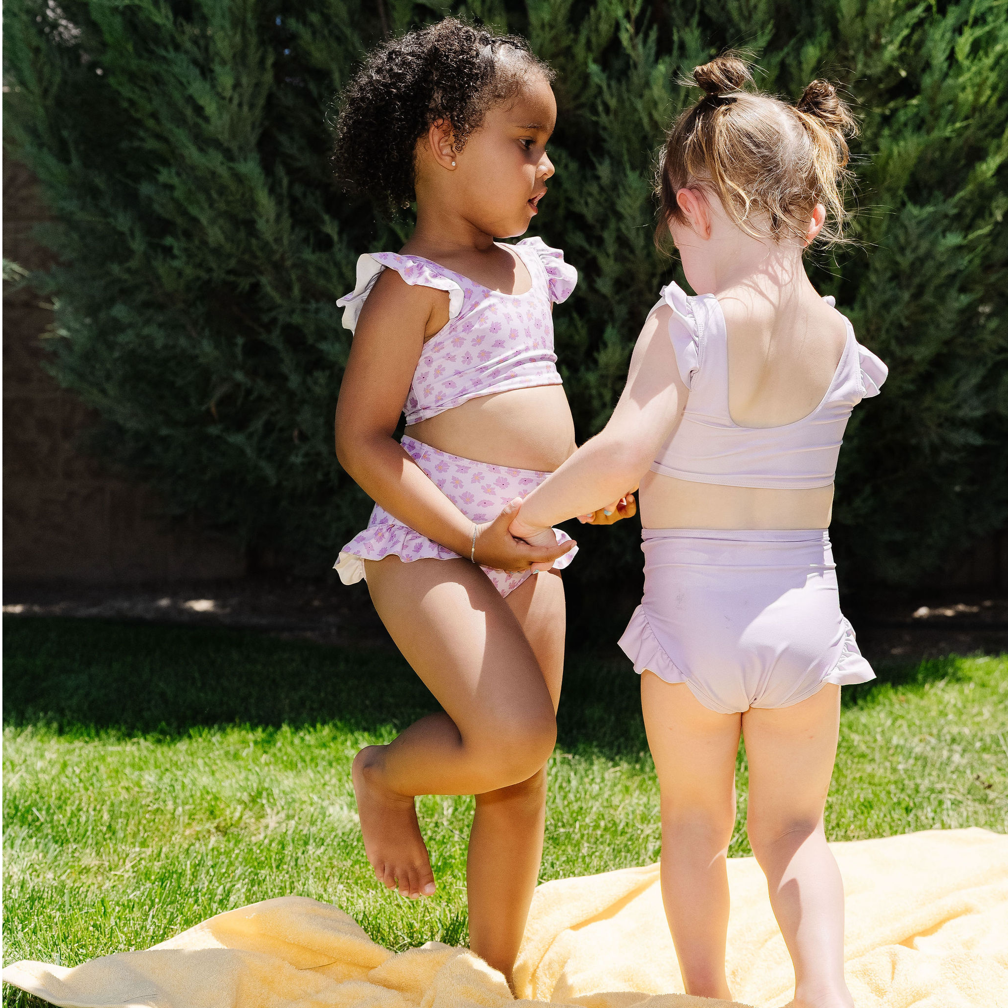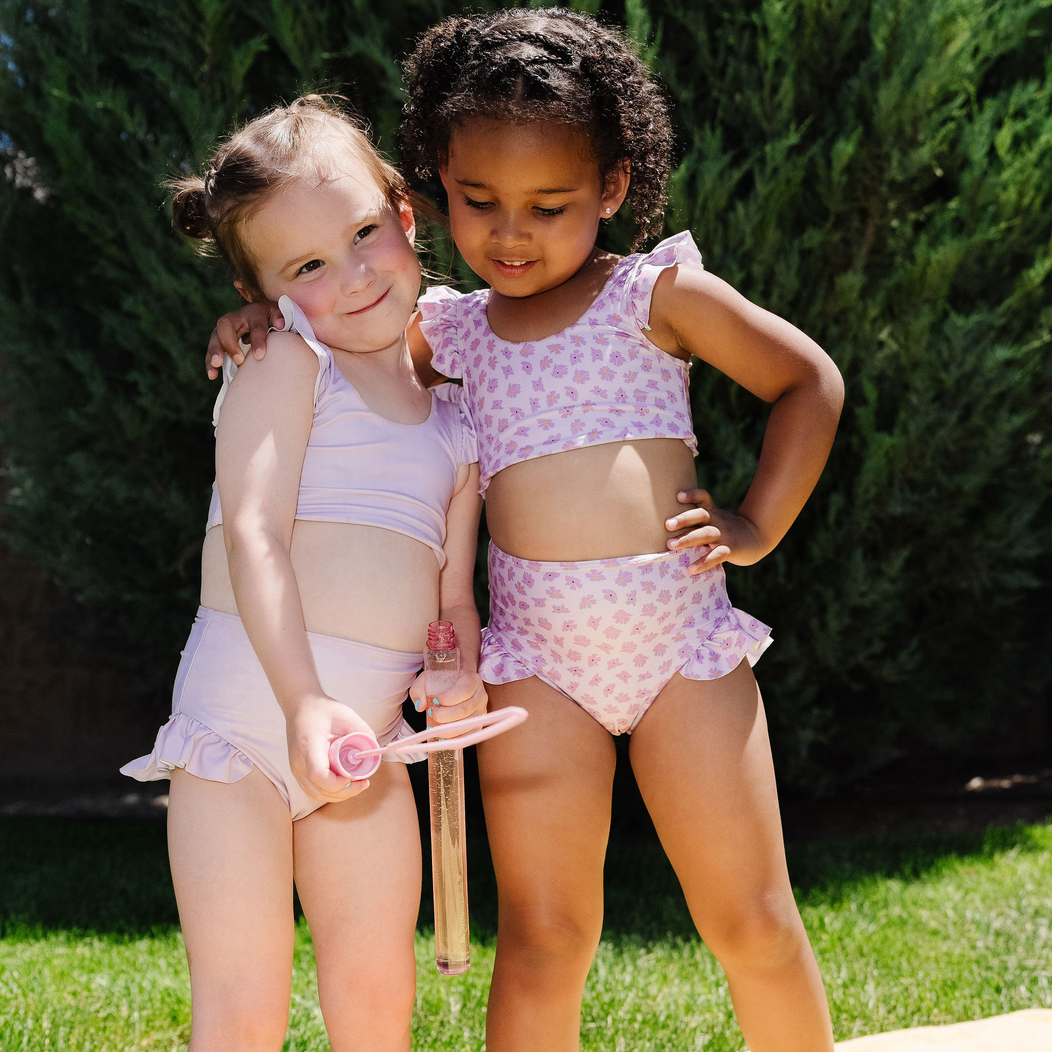 Make a splash at the pool or beach with this adorably frilled bathing suit. Made of 80% recycled polyester, you can feel just as good about her wearing it as it looks.