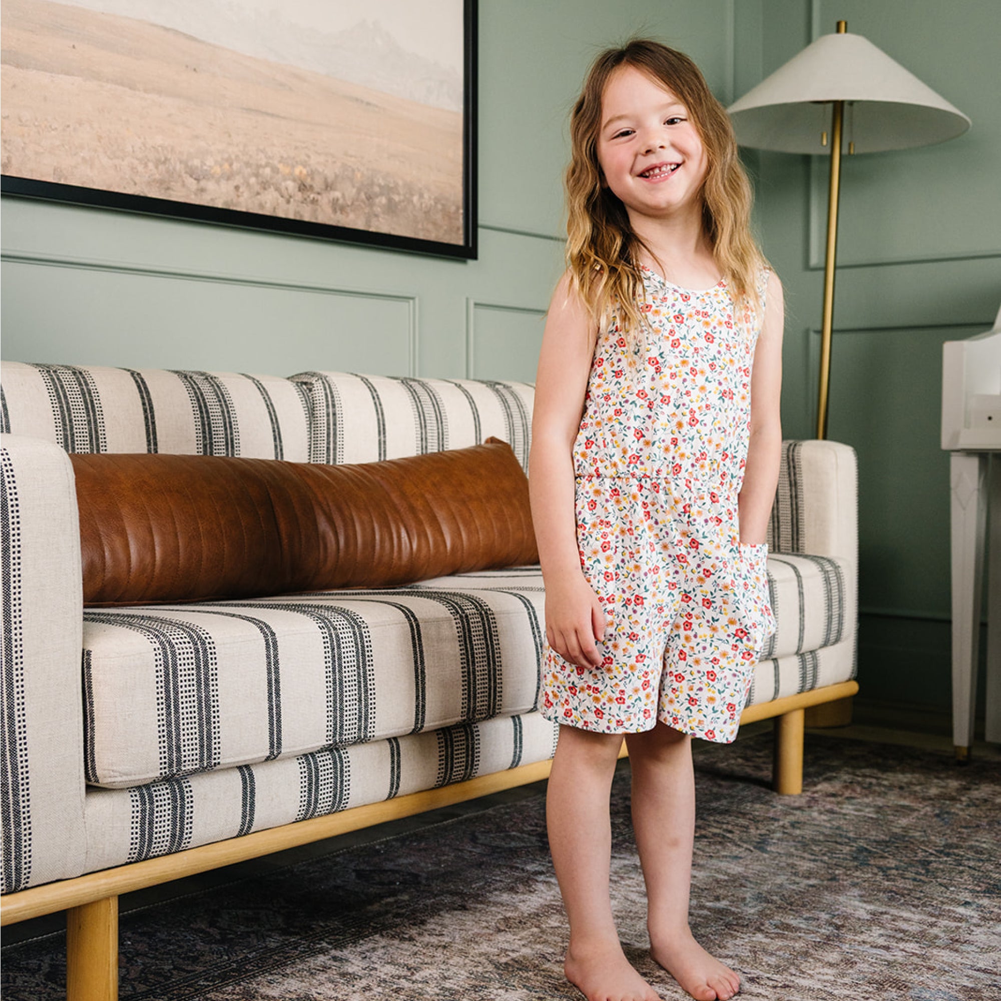 Calling all monkey bar lovers! This jumpsuit is for you. Featuring our signature low scoop back for easy slip-on, a comfy elastic waistline, and custom printed fabric using our favorite cozy cotton stretch. Pair with some classic rain boots, or pair with bare feet, there's really no wrong way to wear the jumpsuit.