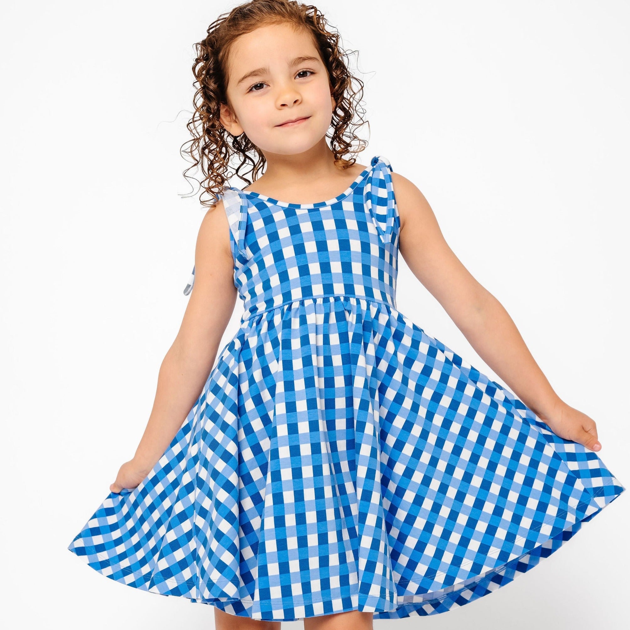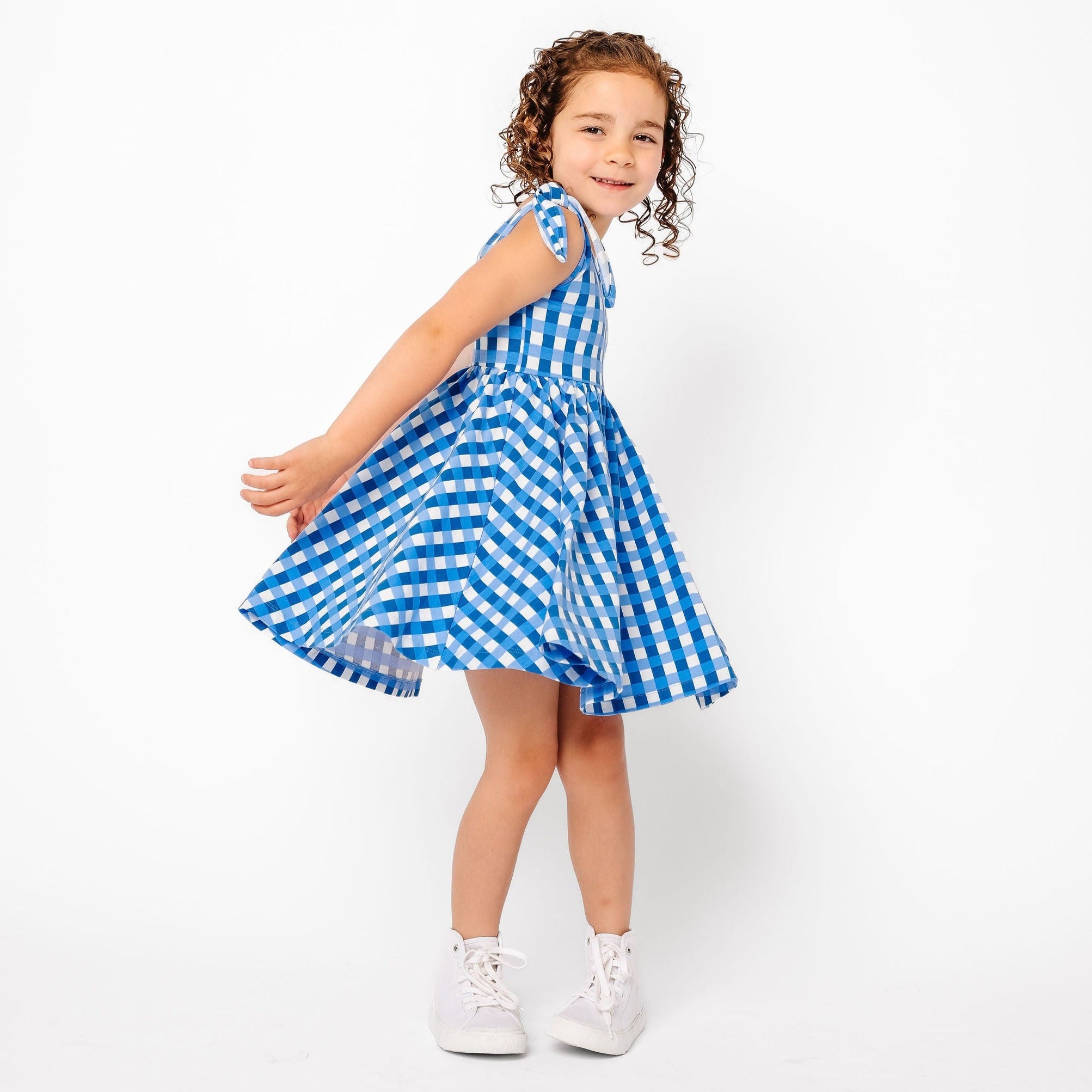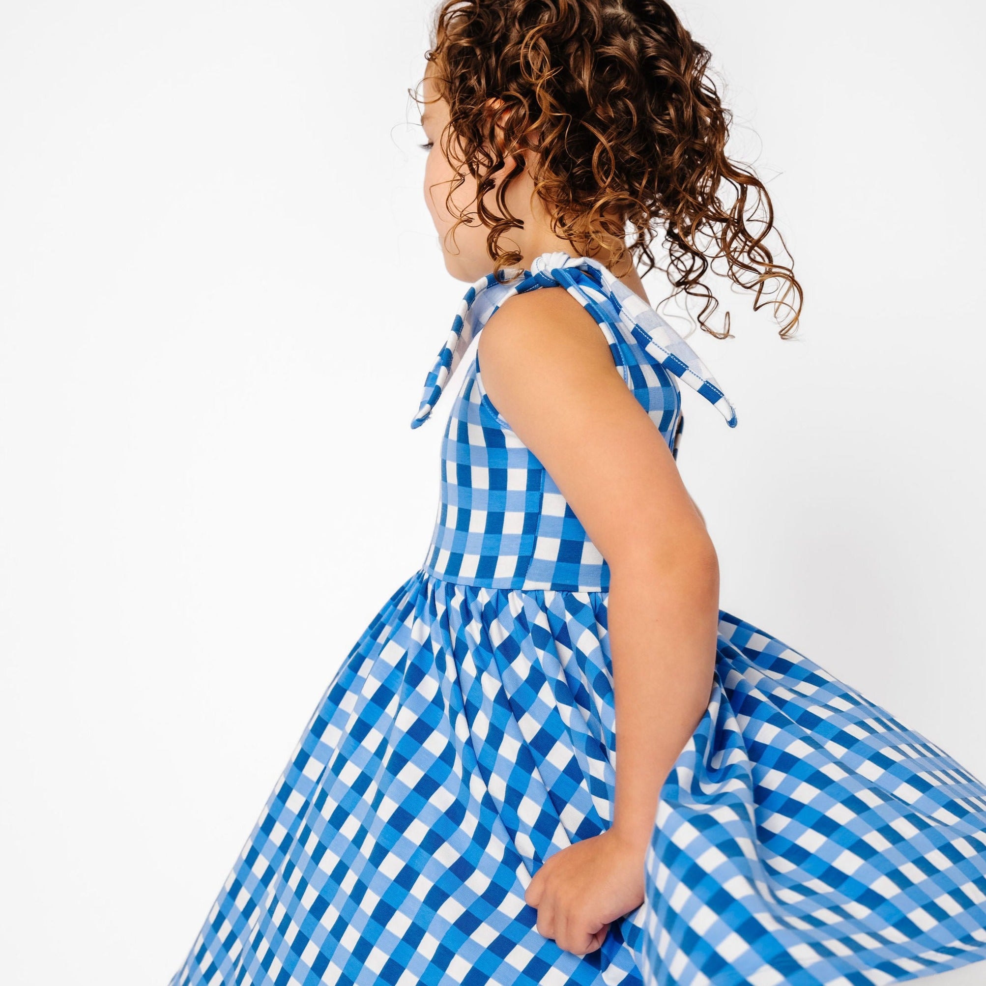 One of my favorite prints to date. Just the perfect little “picnic blanket” design and the blue hearts make it work for Memorial Day or 4th of July! It’s my girls’ new favorite and of course they love the bows on the shoulders!