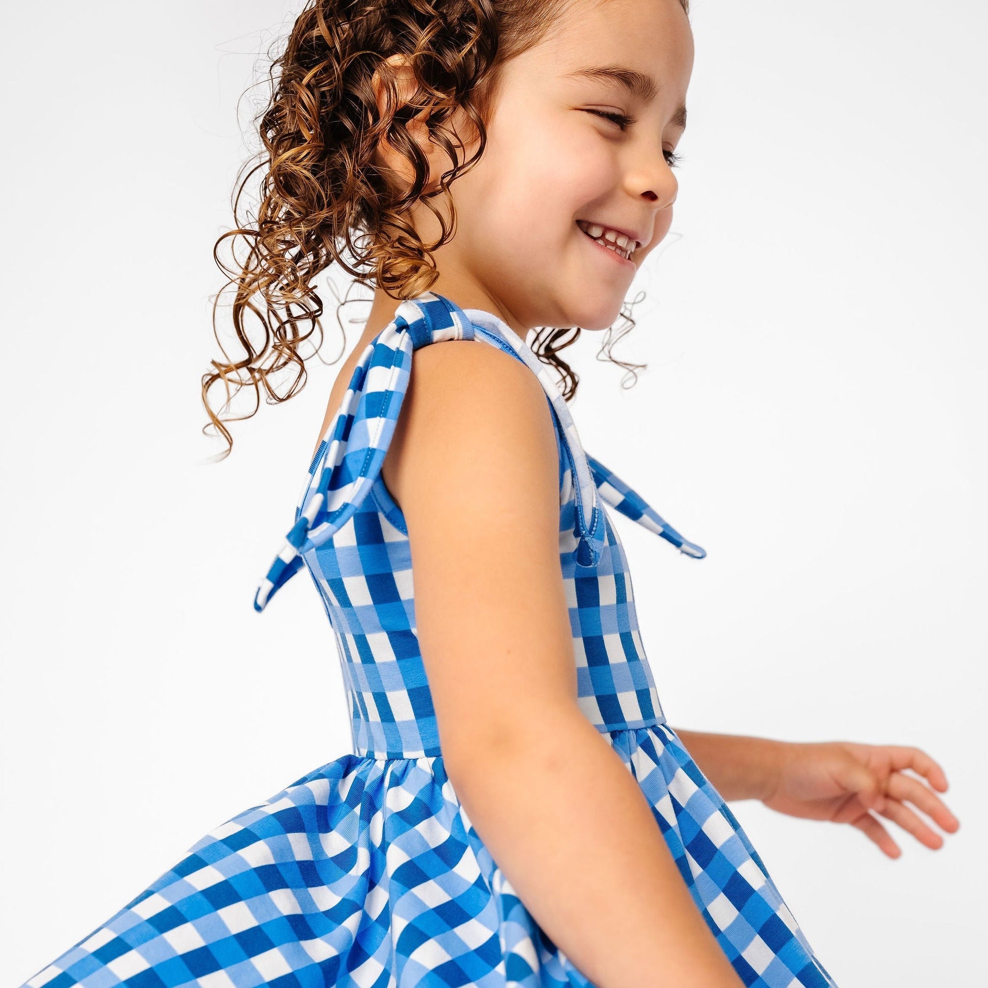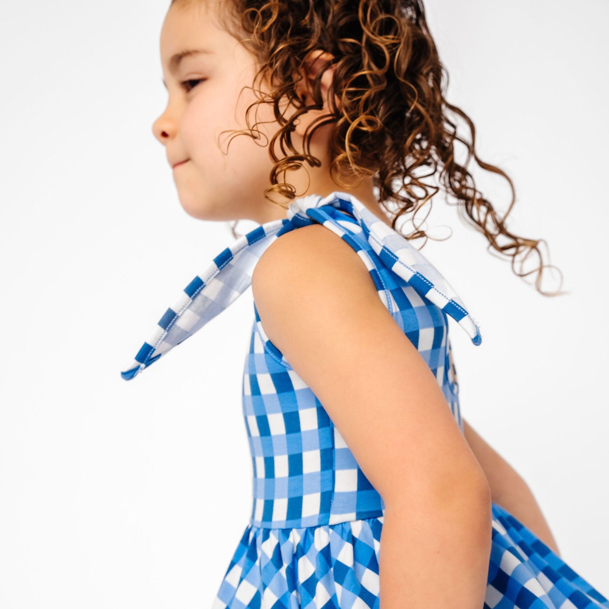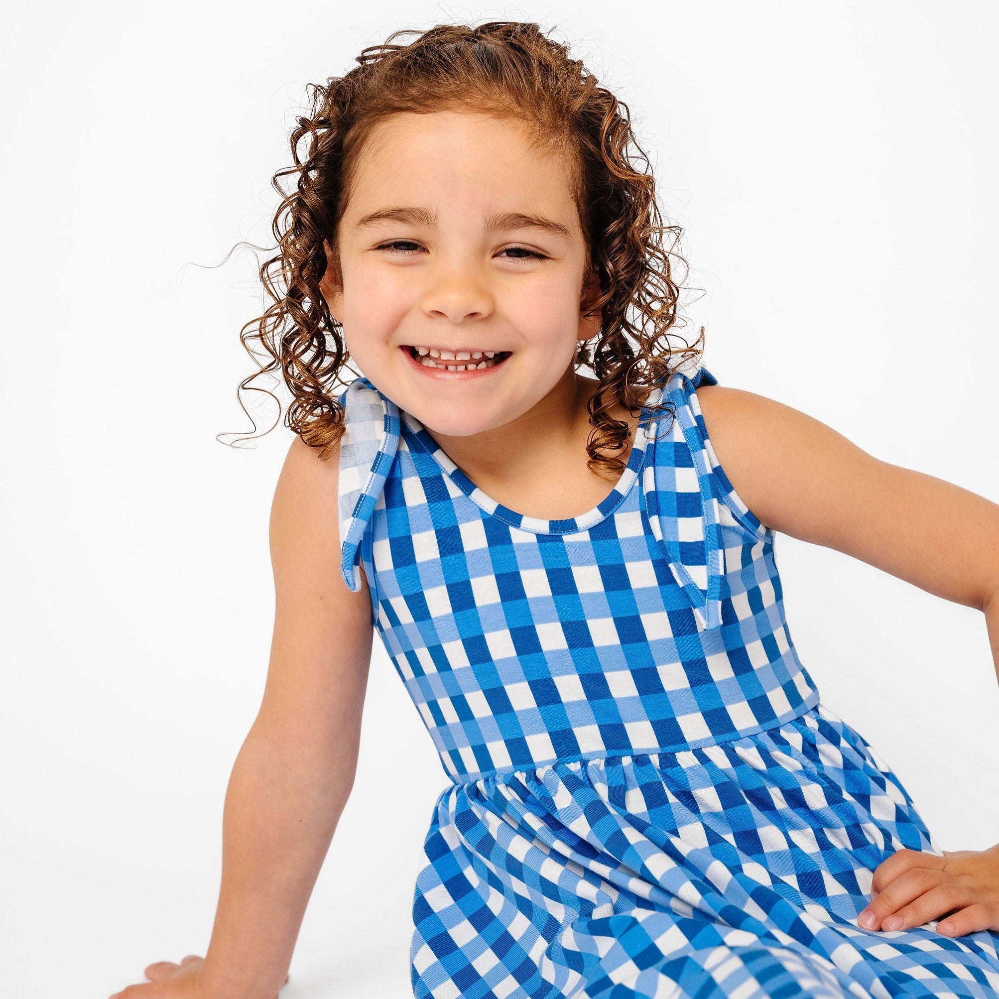 One of my favorite prints to date. Just the perfect little “picnic blanket” design and the blue hearts make it work for Memorial Day or 4th of July! It’s my girls’ new favorite and of course they love the bows on the shoulders!