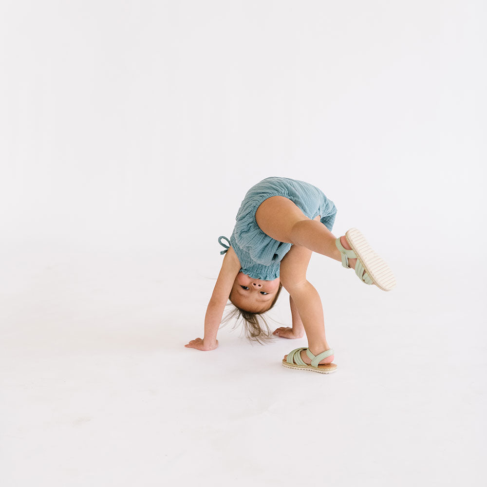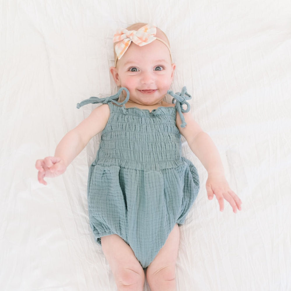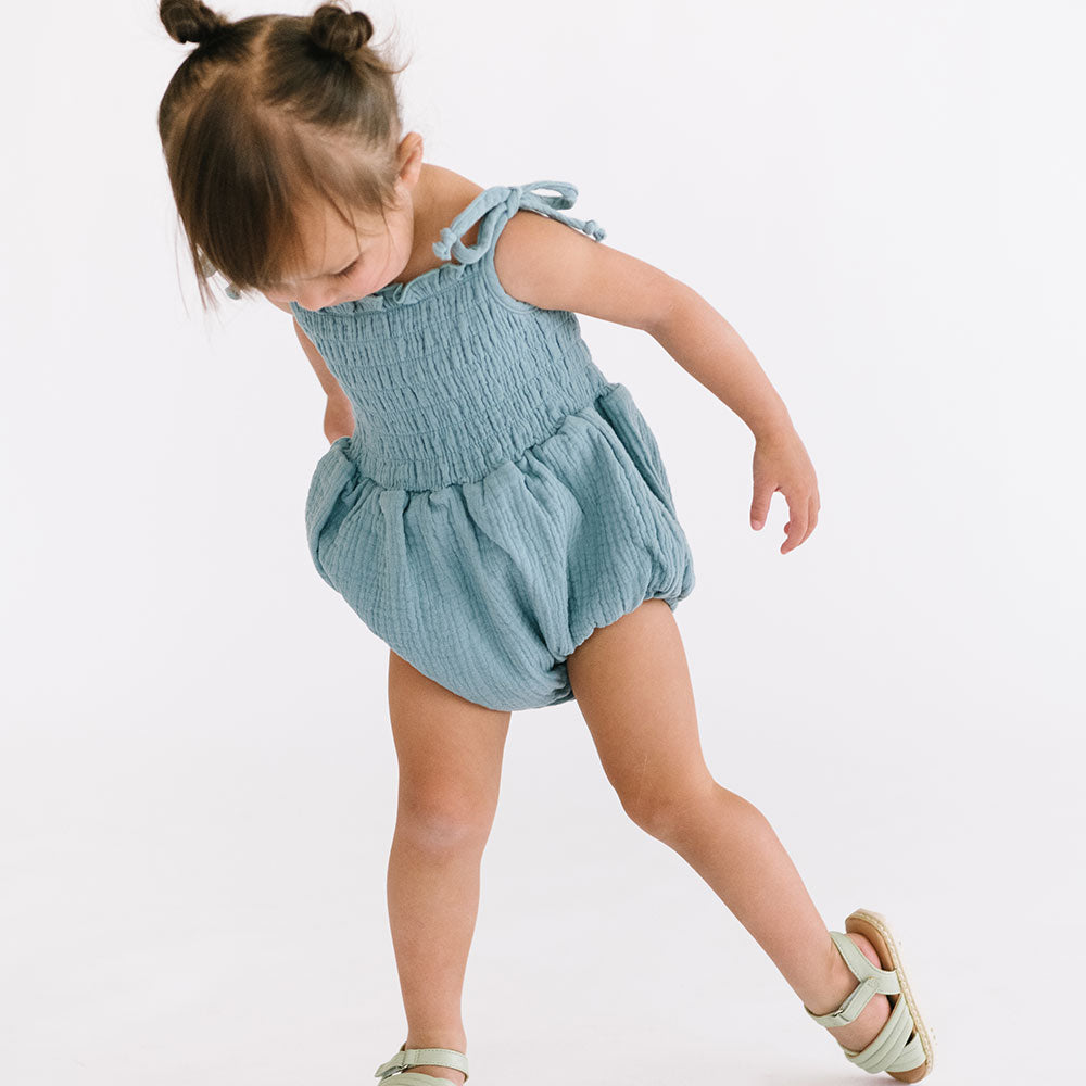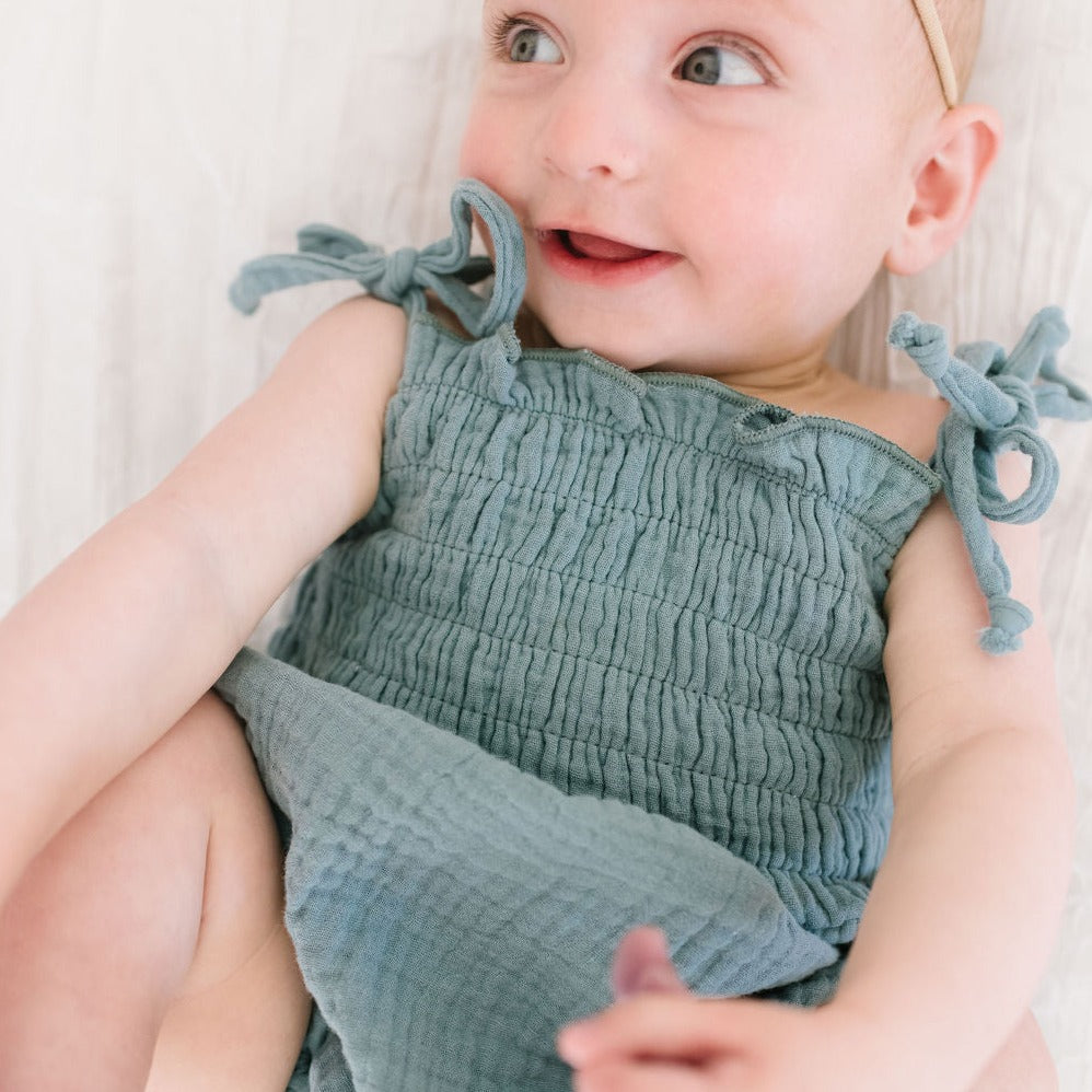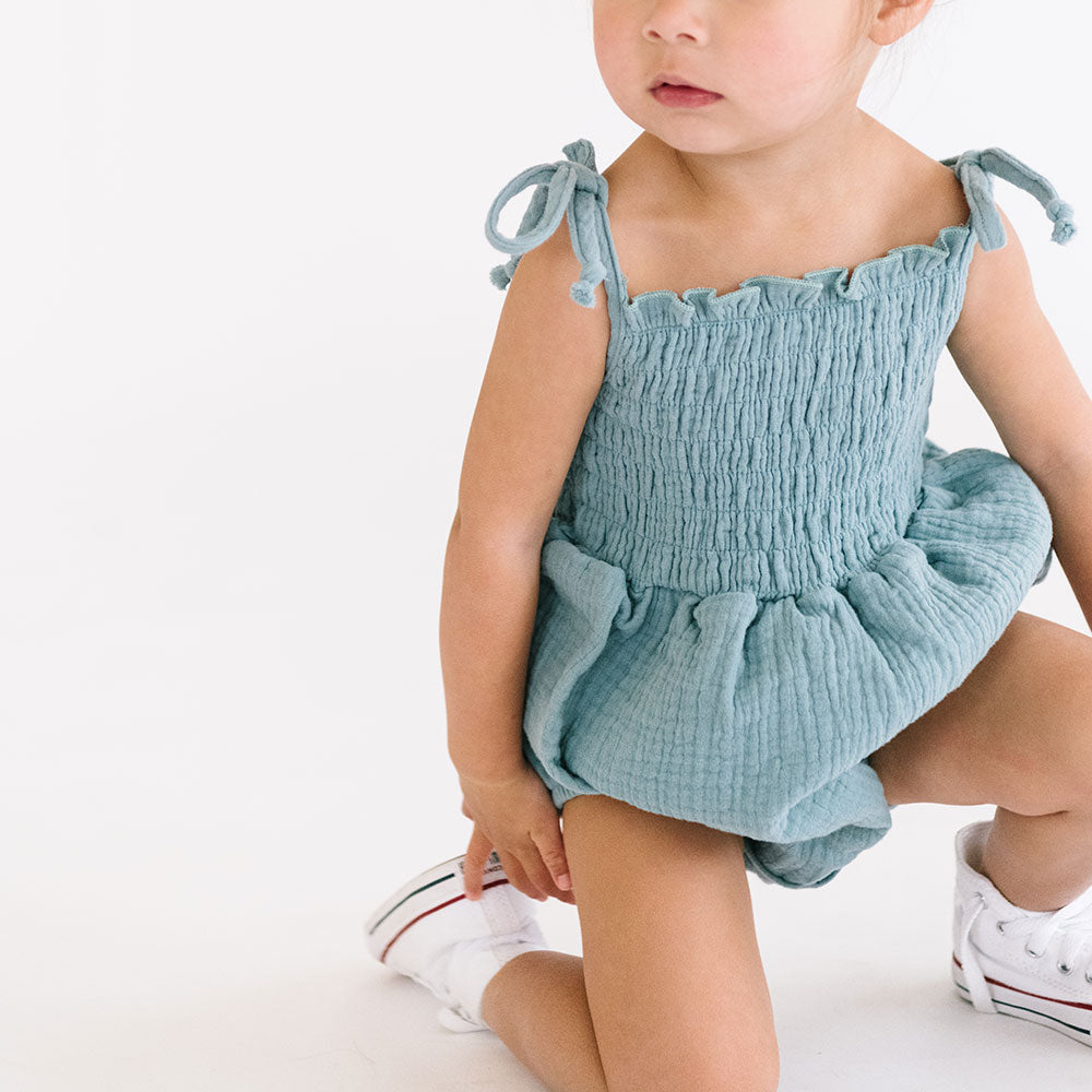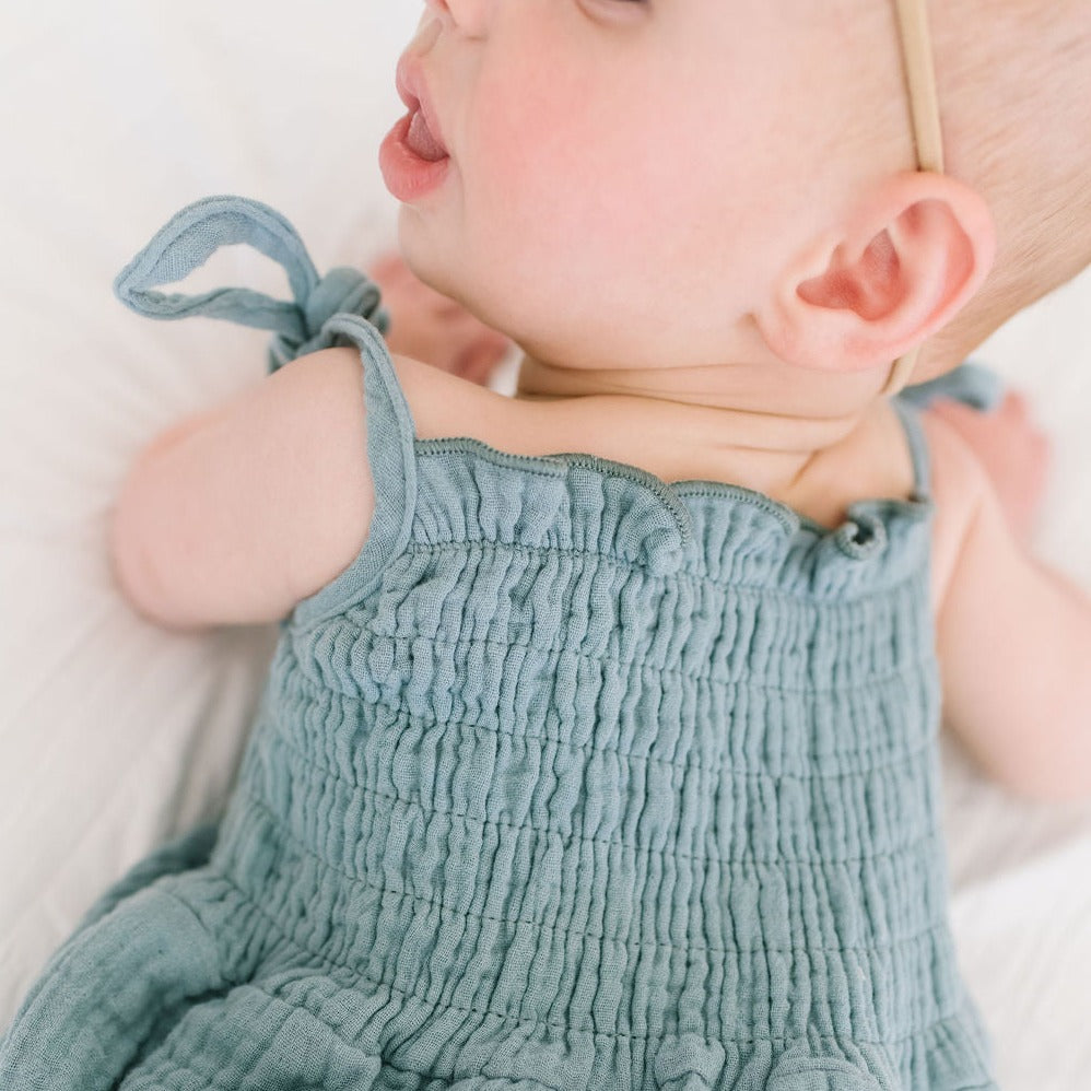 Soft-as-can-be 100% cotton gauze keeps them comfortable, while shoulder ties and a smocked bodice bring just-right structure to this onesie's playful silhouette.