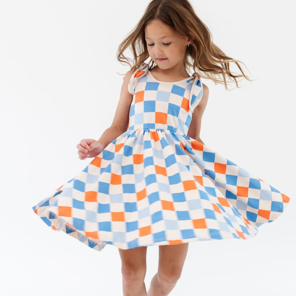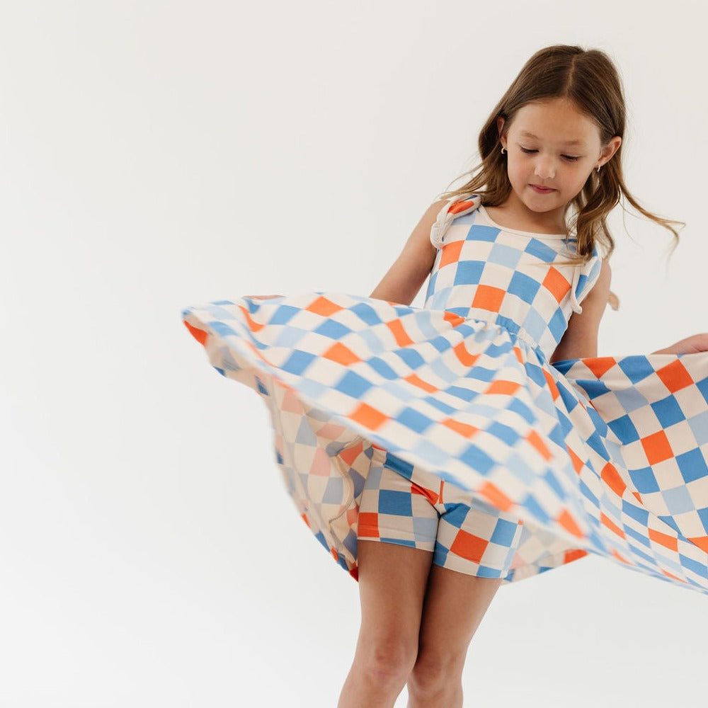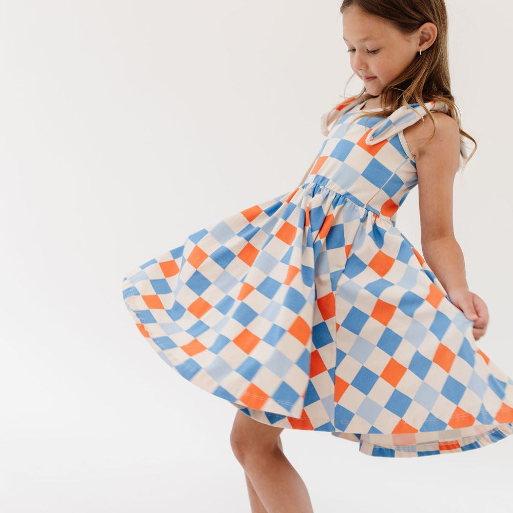 One of my favorite prints to date. Just the perfect little “picnic blanket” design and the blue hearts make it work for Memorial Day or 4th of July! It’s my girls’ new favorite and of course they love the bows on the shoulders!